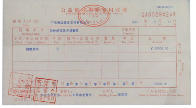 国家有难,匹夫有责。疫情发生后,公司第一时间站了出来,积极响应政府党组织号召。2月17日,江苏龙裕工程承包有限公司通过网络捐款10万元给东莞慈善会,专门用于新冠肺炎疫情防控工作。公司认真贯彻落实国家以及东莞市决策部署和工作要求,在落实好疫情防控各项任务的同时,积极支援湖北、武汉的疫情抗击工作,以实际行动践行了企业的责任担当和初心使命。